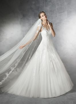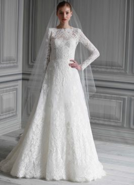 This A-line wedding dress with illusion lace sleeves from the house Christian Heritage is a start to the bride’s attire. Flower-powered lace all throughout the dress creates a daydream effect, while the Flared skirt is perfect for dancing the night away!