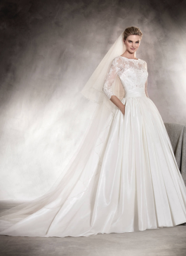 This classically elegant satin wedding dress from Christian Heritage with illusion lace sleeves is sheer perfection.