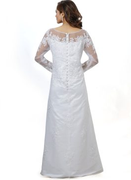 This Christian Heritage gown is perfect for any traditional bride. Illusion sleeves and a dramatic butterfly back design that zips up with ease under fabric-covered buttons adds a hint of glamour to this romantic design.