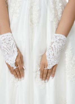Plain White Full finger bridal glove with beaded patchwork from Christian Heritage on your special day.