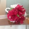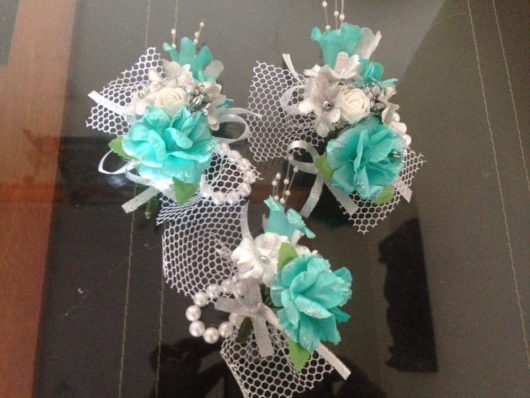 Beautiful hand corsage made with turquoise and white coloured flowers with pearls studded in it, strands of white pearls attached to the flowers, based with white mesh net along with pearl sticks ehance the beauty of this hand corsage. We, also customise these bridesmaids hand corsage as per the theme of the function using a variety of flowers and ribbons.