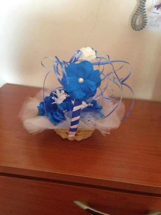 This small looking flower girl basket from Christian Heritage will make your heads turn because we have designed this basket full of flowers in such a way that people come and ask from where did you get these accessories. Blue and White flowers are placed on the white mesh/ net at the basket with centered pearl sticks. The handle of the basket is drapped with white and blue ribbons with a big bluw flower places at one side of the basket embellished with a pearl to make it look just extra-ordinary. Swirls of ribbons are hanging around the basket.